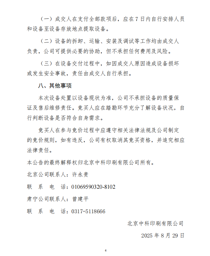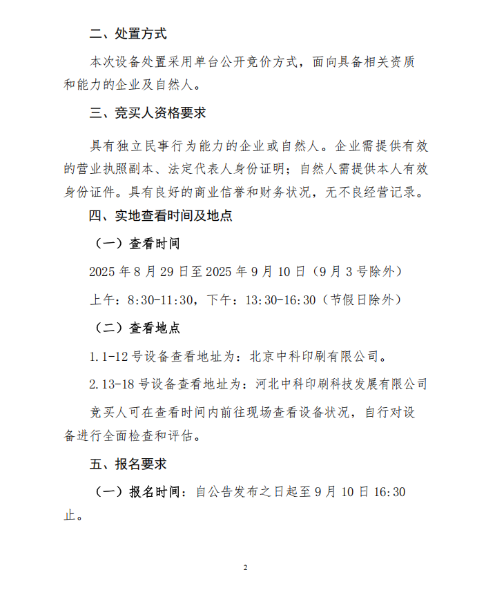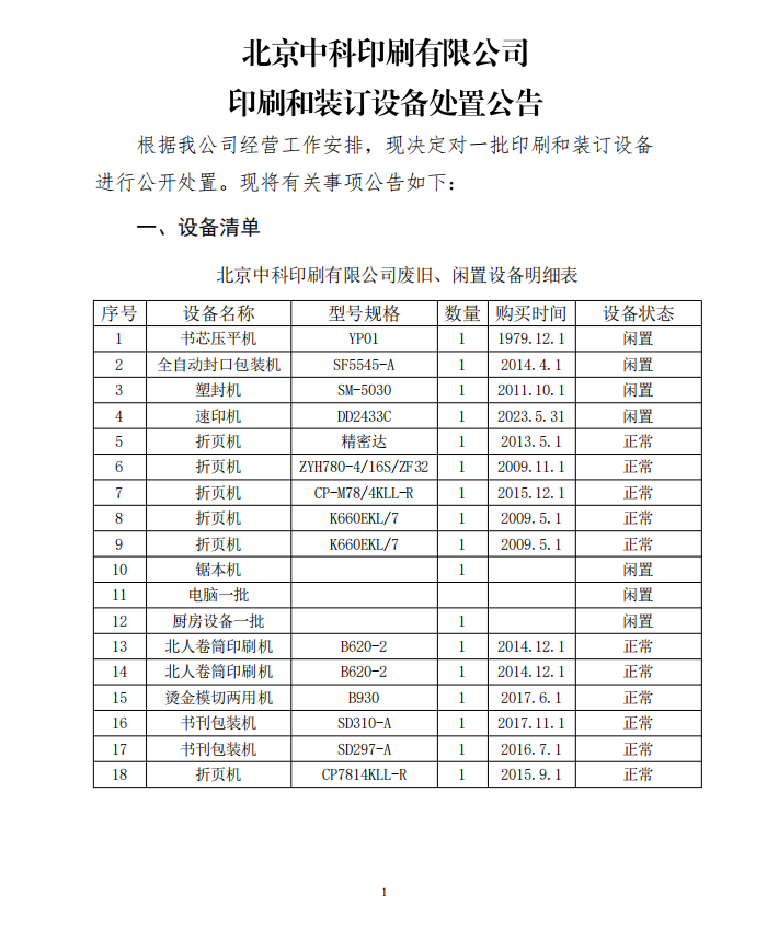 北京中科印刷有限公司 印刷和裝訂設(shè)備處置公告