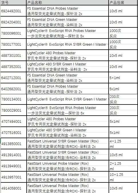 當(dāng)然如果您的儀器需要進行ROX校正,才能得到準(zhǔn)確的熒光結(jié)果,羅氏也能提供另外一系列試劑:FUMM預(yù)混液(含ROX校正染料)。