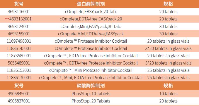 PhosSTOP也以鋁箔片劑形式提供,提高了研究者操作的方便性。工作液可以存放于2~8 °C一個月,或-15~-25°C下6個月以上。為了保證蛋白的完整性,應該在抽提步驟中同時使用cOmplete蛋白酶抑制劑混合物。