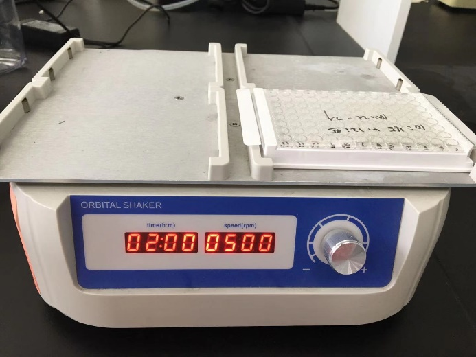 調整搖床速度,讓液體劇烈振蕩,使其幾乎旋轉到微孔板的頂部,但不能形成氣泡或飛濺到封板膜上;