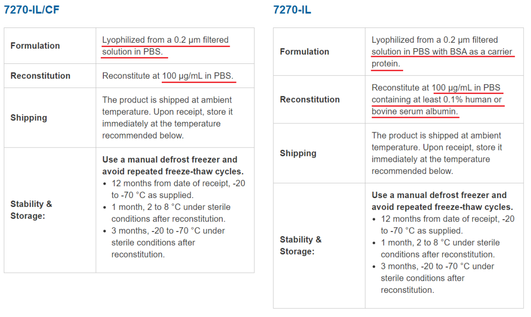是否添加 BSA 是 CF 蛋白產品與普通蛋白產品最大的區別。這一區別使得凍干粉重溶溶液的選擇以及重組蛋白的用途有所差異。