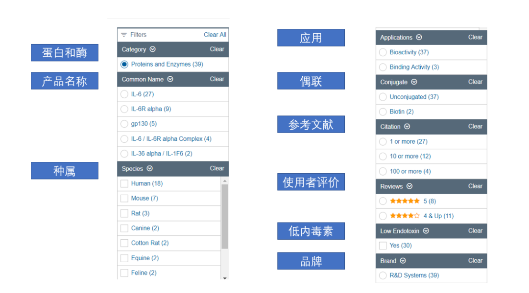 點(diǎn)擊「Proteins and Enzymes」,進(jìn)入到如下頁(yè)面,可以看到有 39 個(gè)產(chǎn)品,下圖對(duì) Filters 中的每一欄也作出中文解析,這里重點(diǎn)介紹一下 Applications 中的 Bioactivity 和 Binding activity 的含義: