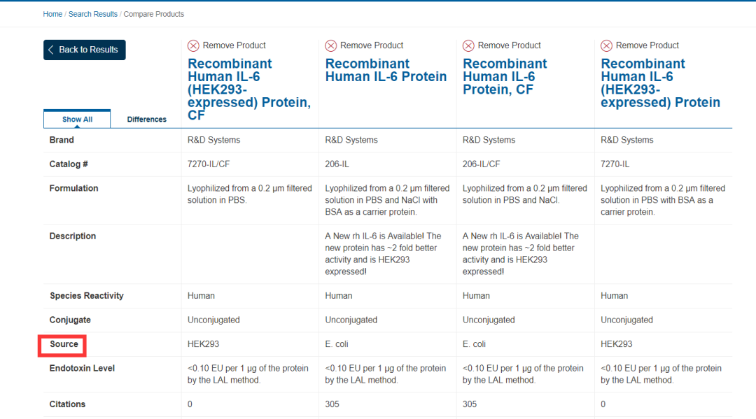此時(shí)會(huì)出現(xiàn)這 4 個(gè)產(chǎn)品詳細(xì)的數(shù)據(jù)對(duì)比,該蛋白有 HEK293 和 E.Coli 兩個(gè)來源:一般來說對(duì)原核細(xì)胞系(大腸桿菌系統(tǒng))而言,蛋白沒有糖基化,最初可能折疊不正確,但是我們有豐富經(jīng)驗(yàn)將這些蛋白質(zhì)重新折疊成正確的結(jié)構(gòu)。