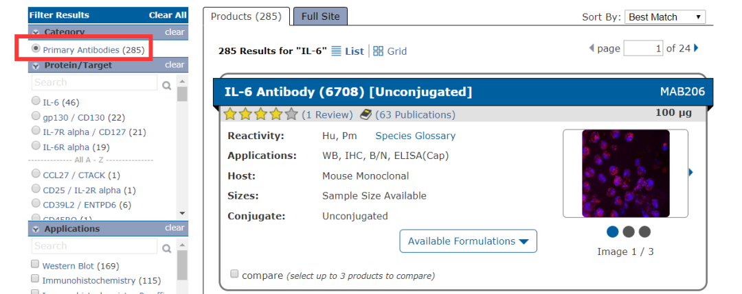 根據(jù)上述蛋白的選擇方法,首先選擇正確的產(chǎn)品名稱 Protein/target,發(fā)現(xiàn)不僅有 IL-6,還出現(xiàn)了 gp130/CD130、IL-7R alpha/CD127 和 IL-6R alpha。這是因?yàn)?IL-6 是一種多效性細(xì)胞因子,通過與配體特異性的 IL-6 受體(IL-6R)和共同的信號(hào)轉(zhuǎn)導(dǎo)受體(gp130)組成的受體系統(tǒng)發(fā)揮生物學(xué)功能,所以也會(huì)搜索出和 IL-6 相關(guān)的抗體。