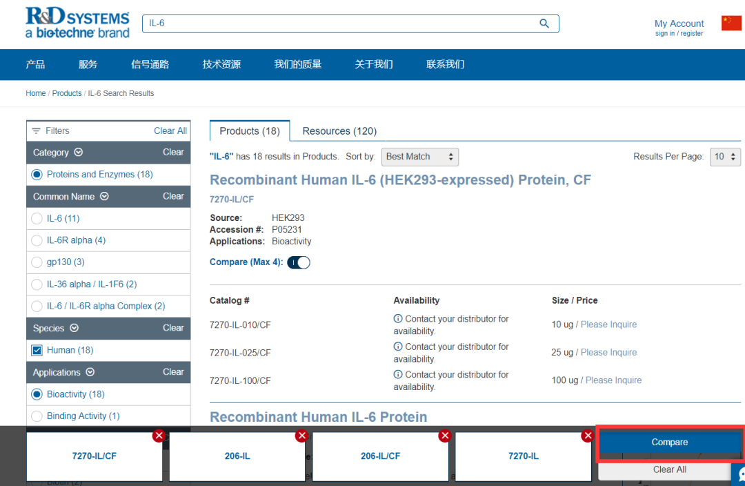 這里也告訴大家 R&D Systems?對(duì)比產(chǎn)品的獨(dú)門秘籍:「Compare」功能,最多可以選擇 4 個(gè)產(chǎn)品,我們以頁(yè)面上的前 4 個(gè)產(chǎn)品為例,選取之后,點(diǎn)擊右下角的「Compare」,