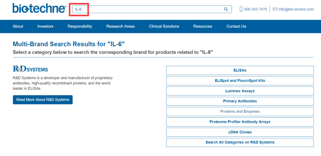 此時(shí),Bio-Techne 旗下 R&D Systems?,Novus Biologicals?,Tocris?,ProteinSimple? 都列出了包含 IL-6 的所有產(chǎn)品類型(下圖僅列出了 R&D Systems? 品牌的相關(guān)產(chǎn)品)。