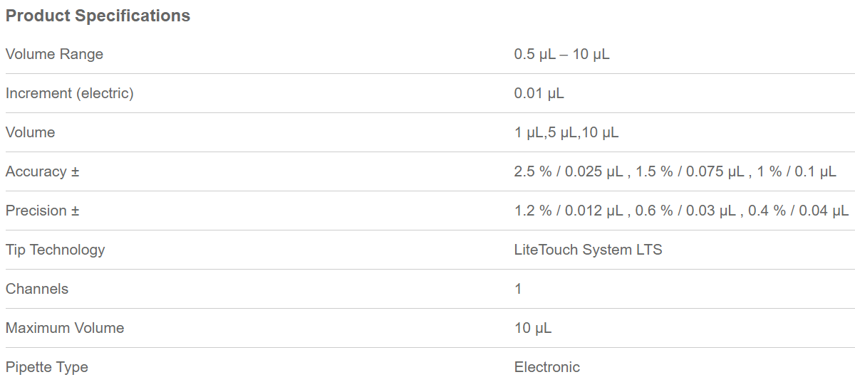 E4? XLS+ electronic single-channel pipette, 0.5-10 μL, uses LTS? LiteTouch? tips. Simple operation, advanced modes. Password-protection, autoclavable liquid end (E4-10XLS+)