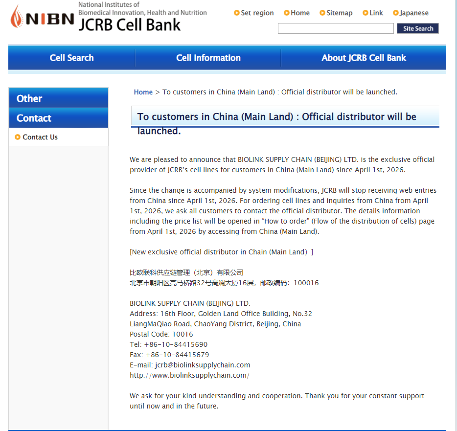 比歐聯科與日本JCRB細胞庫的合作迎來歷史性時刻!自202641日起,比歐聯科正式成為JCRB細胞庫在中國大陸地區的獨家經銷商。