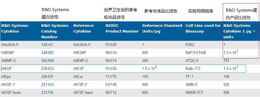 比如人 EGF 蛋白產(chǎn)品(貨號(hào) 236-EG),1 μg=1.4*103 U,如果文獻(xiàn)中所用的濃度為 100 U/mL,換算到該產(chǎn)品的質(zhì)量濃度就是 100/1400=0.07 μg/mL。