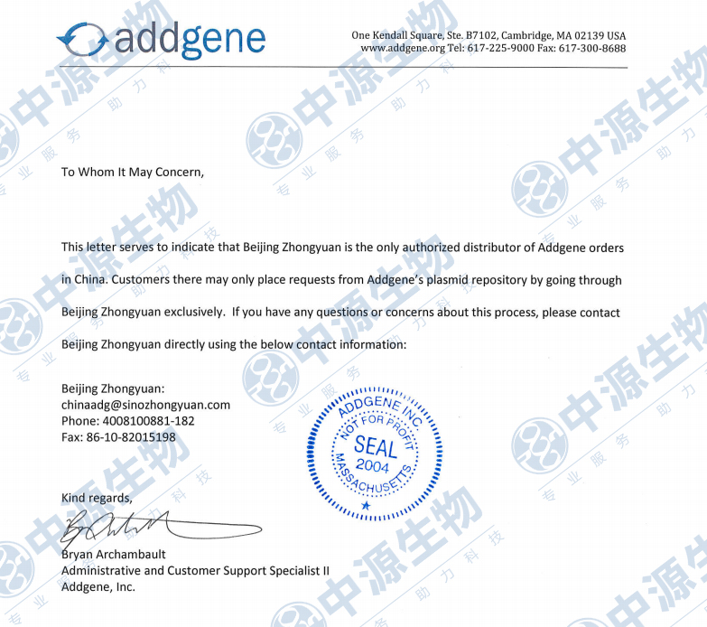 Addgene指定北京中源合聚生物科技有限公司為其中國大陸獨家授權代理商,授權可在Addgene官方網站 https://www.addgene.org/ordering/international/ 上查詢確認。