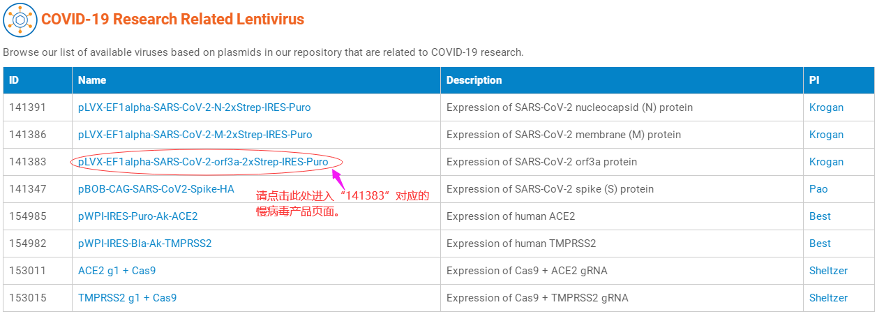 以下是目前可以提供的COVID-19研究相關慢病毒對應的質粒,點擊“Name”列即可進入質粒對應的慢病毒產品頁面,從而可以查詢慢病毒產品的價格、體積、滴度、運輸形式、儲存溫度等信息。
