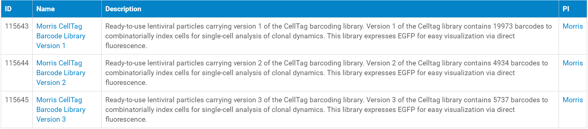 以下是目前可以提供的Barcoding Libraries研究相關慢病毒對應的質粒,點擊“Name”列即可進入質粒對應的慢病毒產品頁面,從而可以查詢慢病毒產品的價格、體積、滴度、運輸形式、儲存溫度等信息。