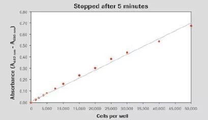 圖1. Cytotoxicity Detection KitPLUS (LDH)具有良好的線性;圖為使用該試劑盒測定不同數目U-937細胞培養基中總LDH活性,底物孵育5min后進行檢測。
