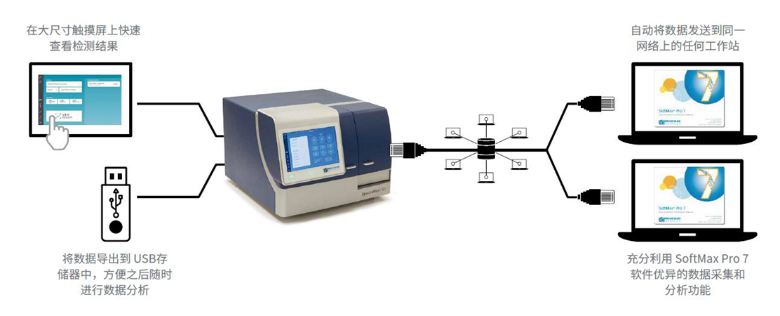 讀板機正面嵌入大尺寸、高分辨率的觸摸屏,您可以通過交互式界面調用內置的 SoftMax 觸屏軟件程序,方便調用預制模板進行檢測或根據(jù)需求修改模板進行相應實驗,無需外置專用的電腦。
